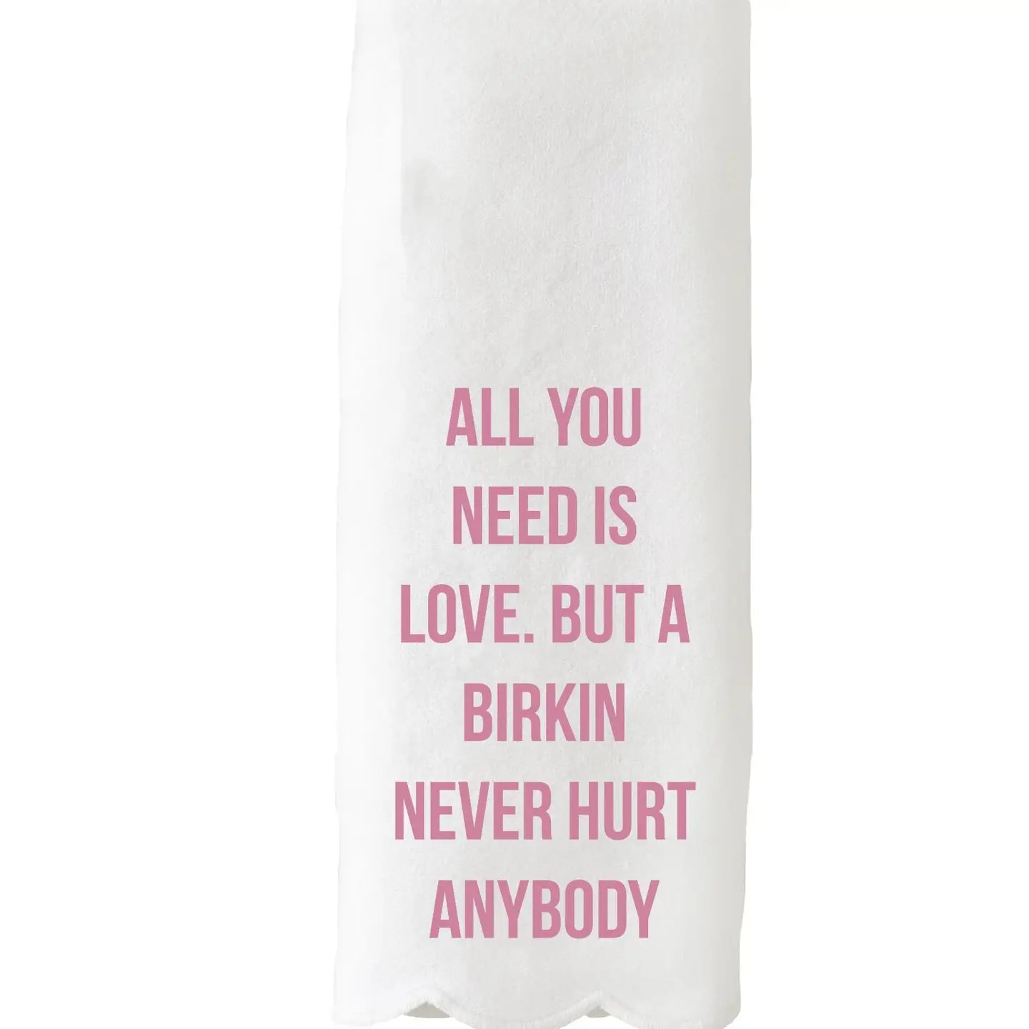 This charming scalloped towel says "All You Need Is Love and A Birkin", perfect for guests who love luxury with a dash of humor. Delicate scalloped edges add elegance, while the playful message brings personality to any bathroom. Soft, absorbent, and guaranteed to get a smile.